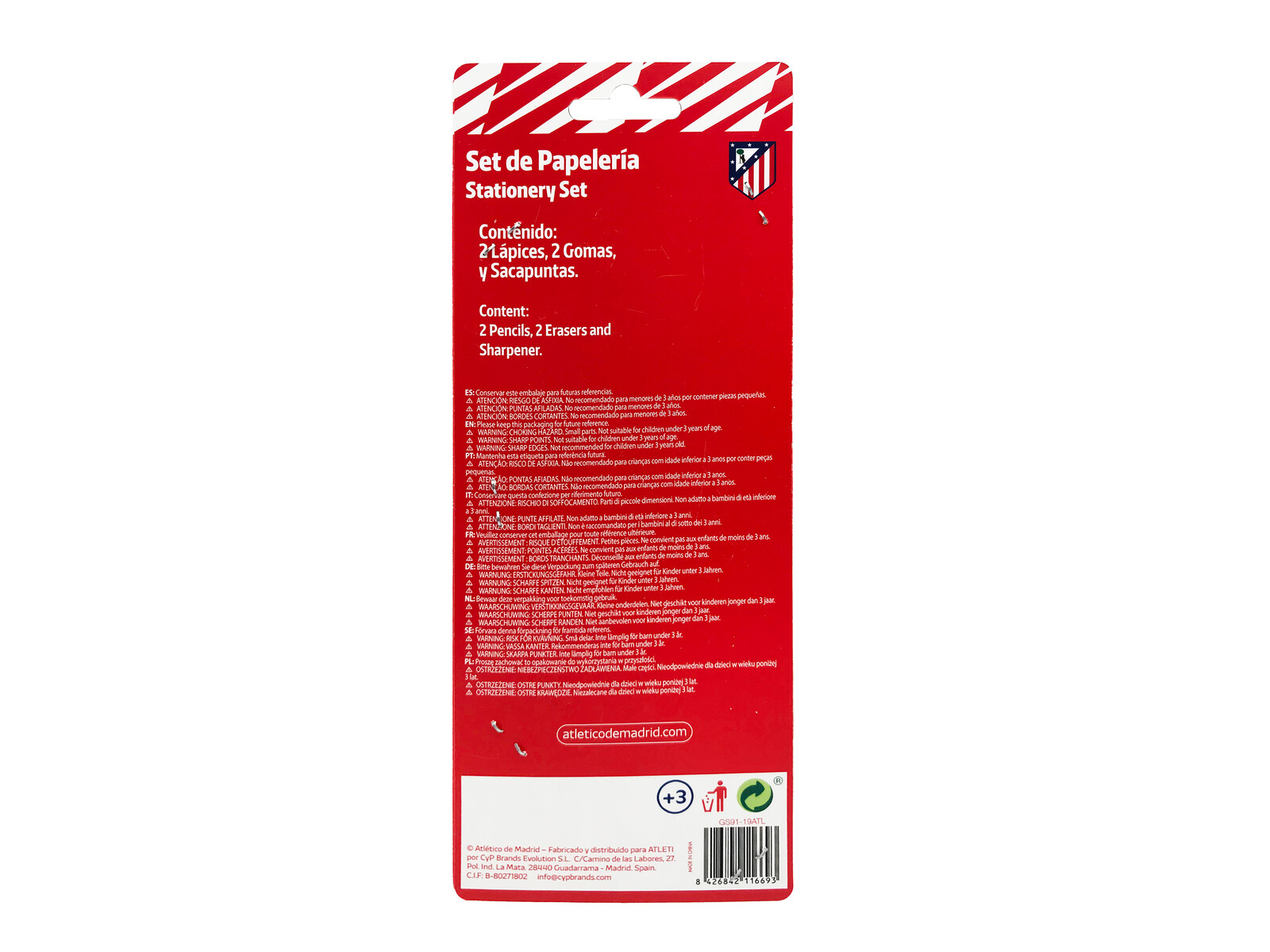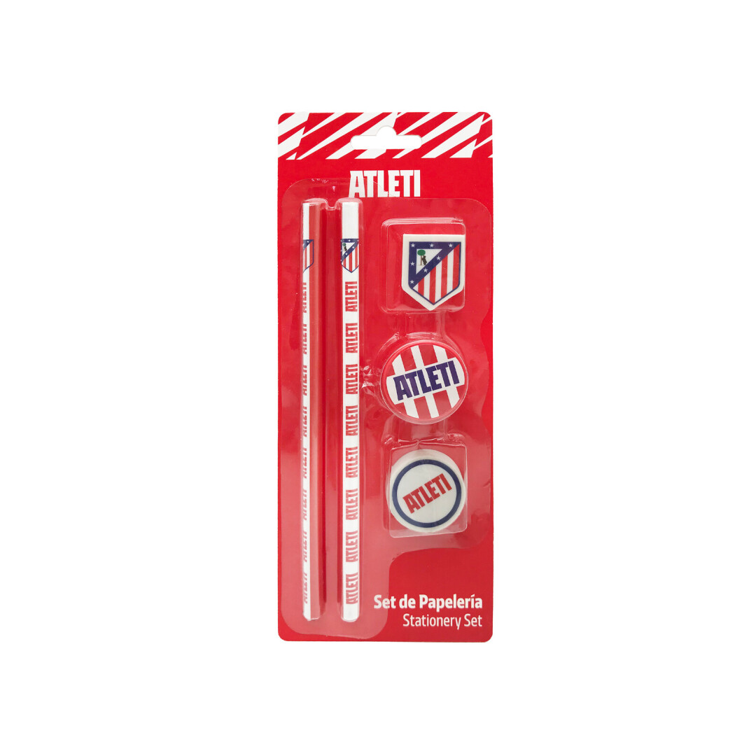 ATLETICO DE MADRID: Set de papelería 5 piezas CARACTERÍSTICAS: Los diferentes artículos de este set cuentan con el escudo y los colores del Atlético de Madrid. Contiene 2 lápices, 2 gomas de borrar y un sacapuntas. Ideal para uso escolar y llevar contigo los colores de tu equipo. PRODUCTO DE CALIDAD: Diseñado en España siguiendo todos los procesos de fabricación y calidad de acuerdo con la normativa europea. Utilizamos materiales resistentes y de gran calidad en todos nuestros productos poniendo gran esfuerzo en crear diseños especiales para ti. MARCA: Este producto licenciado es oficial y 100% original.