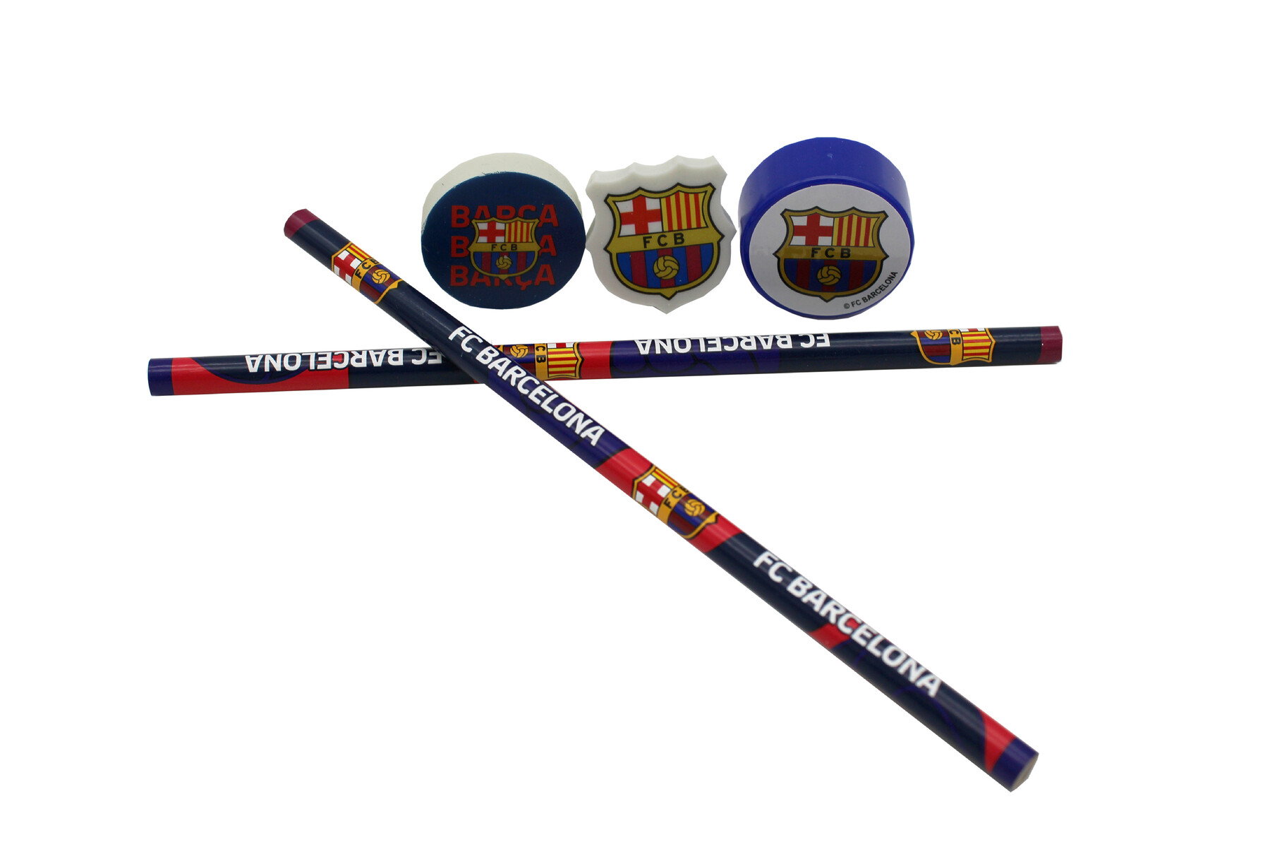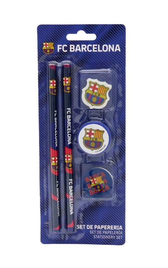 FC BARCELONA: Set de papelería de uso escolar para desarrollar la imaginación y la creatividad. CARACTERÍSTICAS: Los diferentes artículos de este set cuentan con el escudo y los colores del Barça. Contiene 2 lápices, 2 gomas de borrar y un sacapuntas. PRODUCTO DE CALIDAD: Diseñado en España siguiendo todos los procesos de fabricación y calidad de acuerdo con la normativa europea. Utilizamos materiales resistentes y de gran calidad en todos nuestros productos poniendo gran esfuerzo en crear diseños especiales para ti. MARCA: Este producto licenciado es oficial y 100% original.
