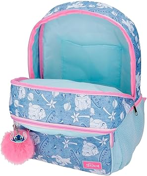 Mochila de 32 cm x 44 cm x 17 cm fabricada en Poliéster. Doble compartimento principal para guardar libros, libretas y todo el material escolar necesario. Con doble tirador de cremallera para que su apertura sea más fácil y cómoda. Dos bolsillos frontales de cremallera, uno de ellos con organizador para bolígrafos, bolsillo de rejilla y accesorios escolares, y dos bolsillos laterales para guardar la botella de agua o pequeños accesorios. Tirantes anchos, ergonómicos y acolchados que se adaptan perfectamente a la espalda garantizando la máxima comodidad en tus desplazamientos. Posibilidad de incorporarle un carro opcional gracias a su banda trasera y al sistema Magic Fix que permite una mayor sujeción de la mochila al carro. Incluye un llavero pompón decorativo que completa el diseño añadiendo un toque de personalidad.