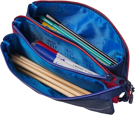 FC BARCELONA : Portatodo triple con 5 compartimentos Barça CARACTERÍSTICAS: Cuenta con tres amplios compartimentos donde llevarás tu material bien organizado y además con otros dos más pequeños ideales para llevar cromos, cartas o notas. Cuenta con dos cremalleras, una exterior y otra interior para asegurar que tu material no se pierda. Tirador de rubber personalizado de gran resistencia para que puedas abrirlo y cerarlo fácilmente. PRODUCTO DE CALIDAD: Diseñado en España siguiendo todos los procesos de fabricación y calidad de acuerdo con la normativa europea. Utilizamos materiales resistentes y de gran calidad en todos nuestros productos poniendo gran esfuerzo en crear diseños especiales para ti MARCA: Este producto licenciado es oficial y 100% original